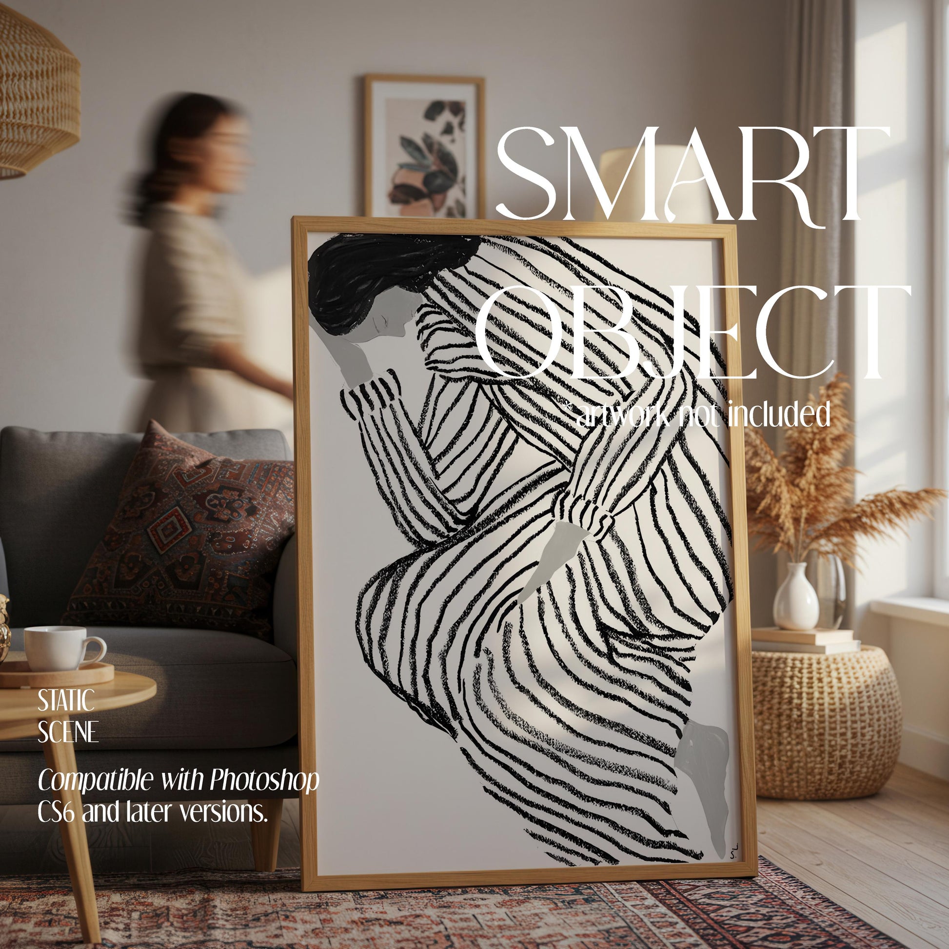 Highlight your creations with a woman or person in the scene, adding a relatable, human element. Download now and transform your frame presentations with these versatile, high-quality mockups!