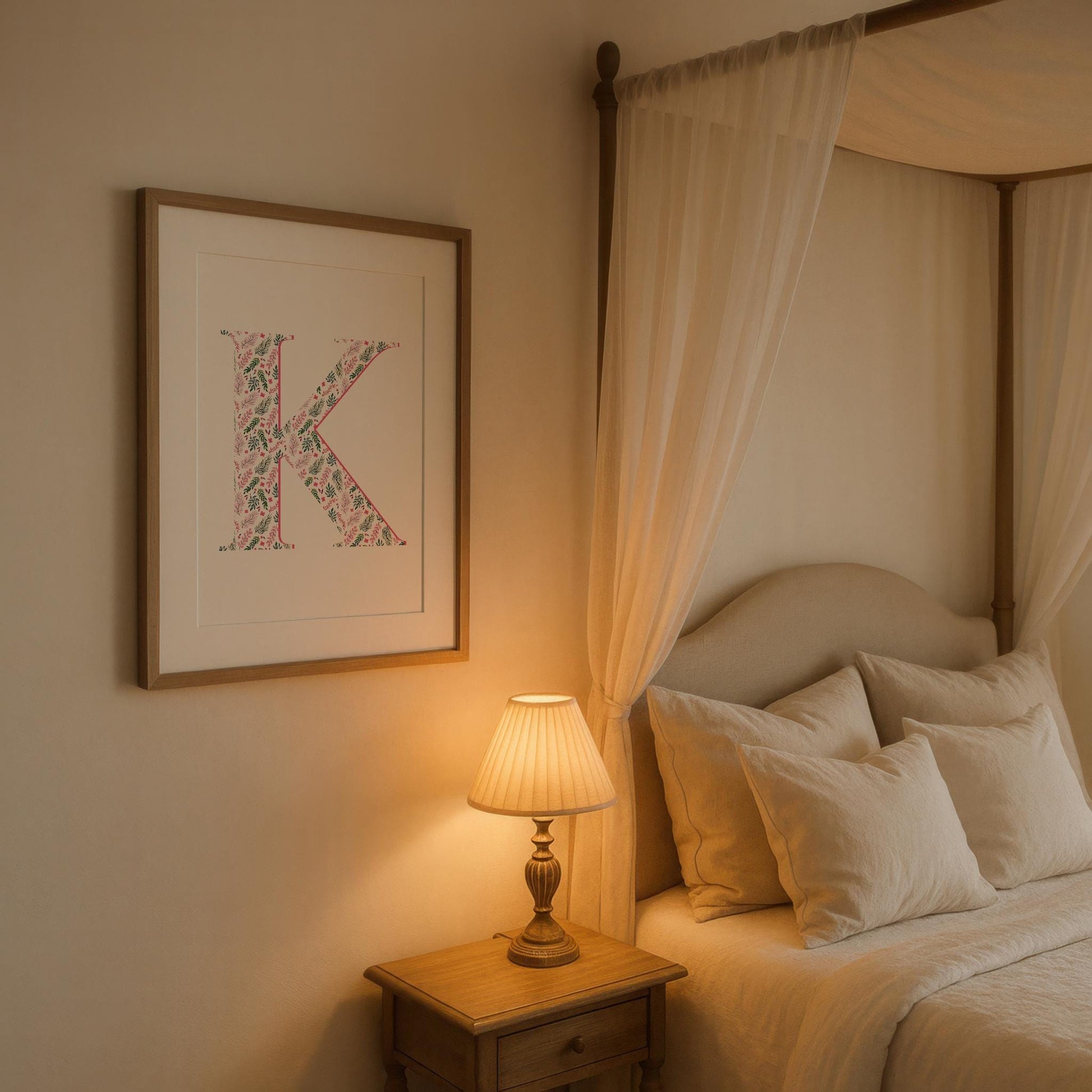 Add a touch of timeless charm and elegance to your space with this Personalized Letter Nursery Art, featuring a delicate botanical chinoiserie style. Perfect for celebrating a new arrival, adding flair to a baby girl nursery, or giving a thoughtful gift for her.