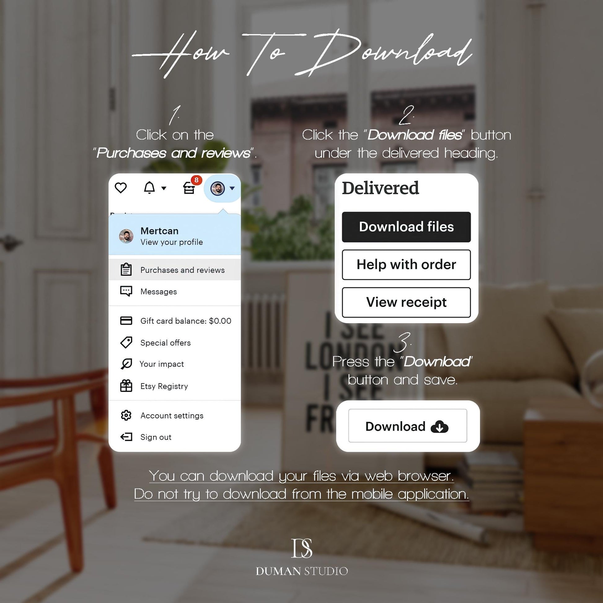 • To access your digital file(s), go to Your Account > Purchases and Reviews (https://www.etsy.com/your/purchases) and look for the order.