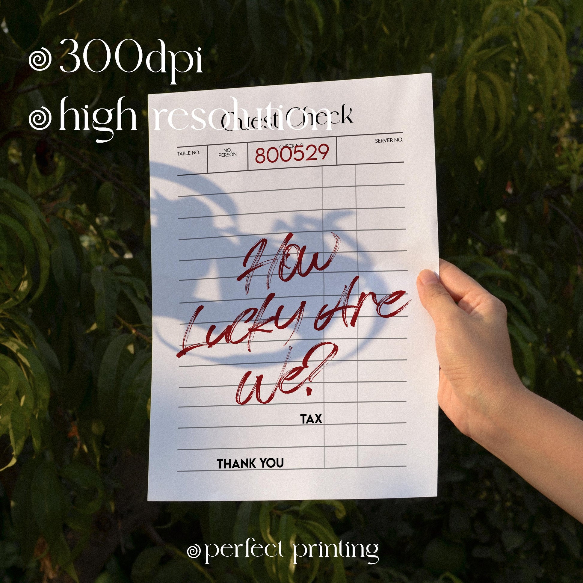 Guest Check Poster: A retro guest check design featuring the handwritten-style phrase "How lucky are we" creates a simple yet impactful vibe.