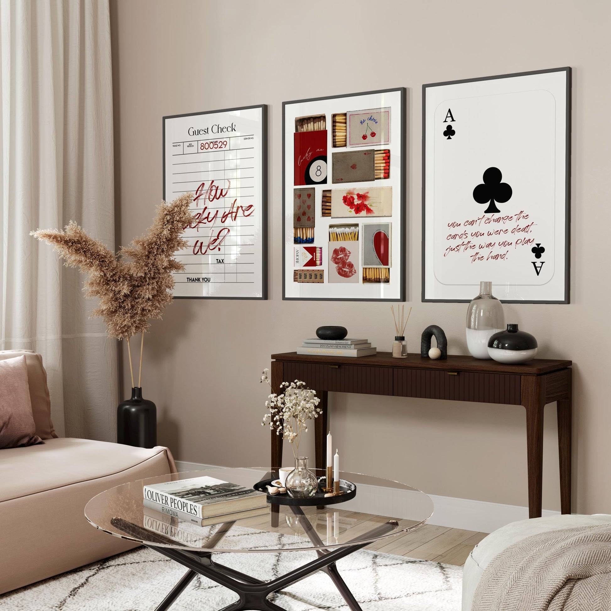 Minimalist Black & Red Poster Set: Vintage Matchbox, Guest Check, Playing Card Prints (Digital Download)